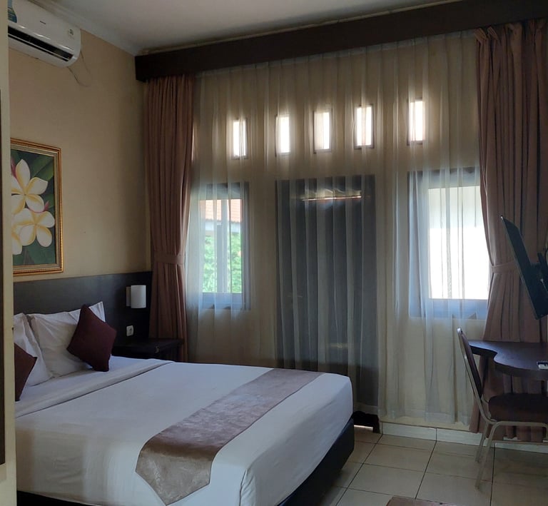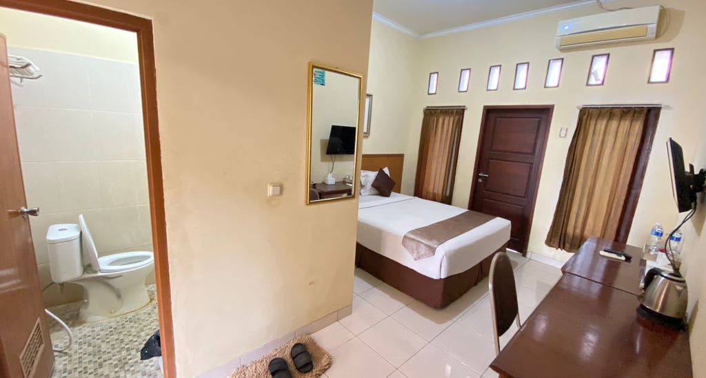Kamar nyaman dengan fasilitas lengkap, ac, kulkas mini, amenities, mineral water, kopi dan teh, pemanas air elektrik, kamar mandi di dalam dengan air panas, cocok untuk perjalanan singkat dengan harga terjangkau.